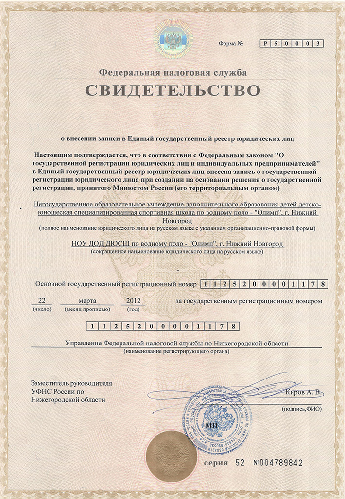 СВИДЕТЕЛЬСТВО О ВНЕСЕНИИ ЗАПИСИ В ЕДИНЫЙ ГОСУДАРСТВЕННЫЙ РЕЕСТР ЮРИДИЧЕСКИХ ЛИЦ